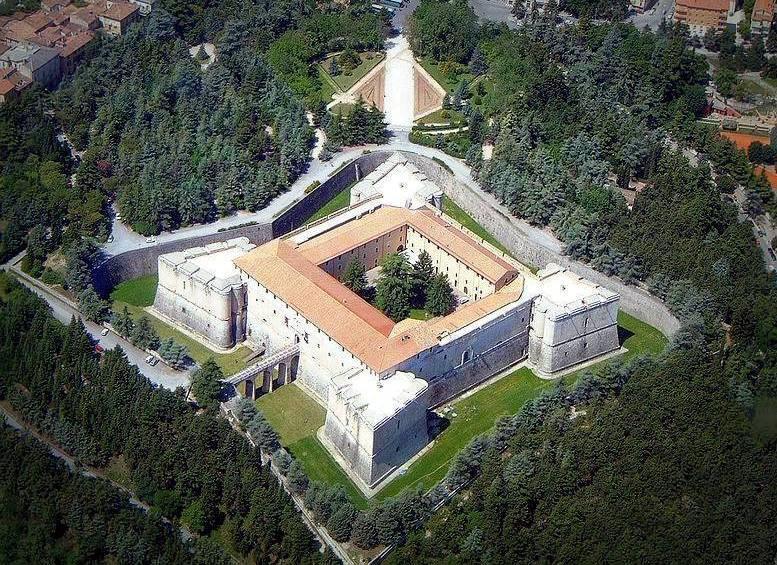 La Struttura: È una possente fortezza a pianta quadrata con quattro grandi bastioni angolari a forma di lancia, circondata da un fossato profondo mai riempito d'acqua.